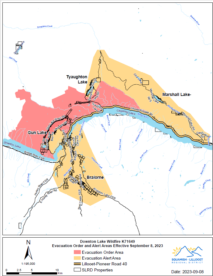 NOTE: Some properties on the east side of Gun Lake , Marshall Lake, Tyaughton Lake, Gold Bridge and Bralorne have been downgraded from Evacuation Order to Evacuation Alert. Please see the updated Evacuation Alert document issued September 8th, 2023 for more details.